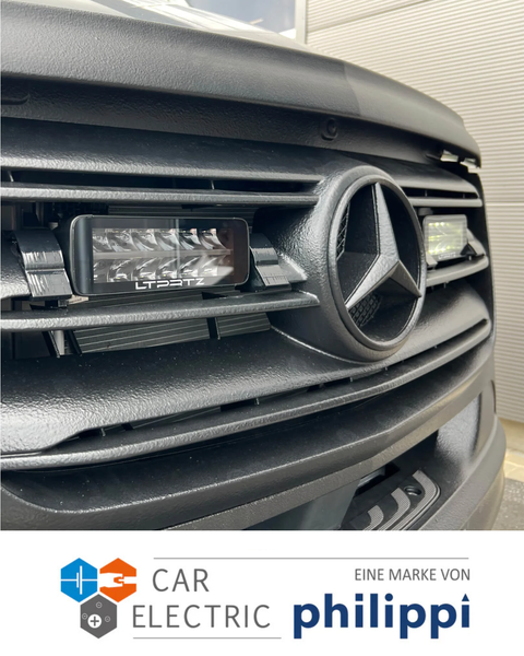 LED-Lightbar LTPRTZ TRX 3.0 7 Zoll passend für den Kühlergrill im MB Sprinter W907 (ab 2018) inklusive Halter und Relaiskabelsatz mit Bluetooth-Dongle ohne Kabel in den Fahrgastraum.